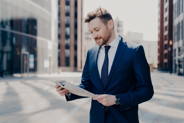 Confident business owner dressed in blue suit feeling delighted after reading positive feedback about his suggested project in local newspaper, walking alone at office
