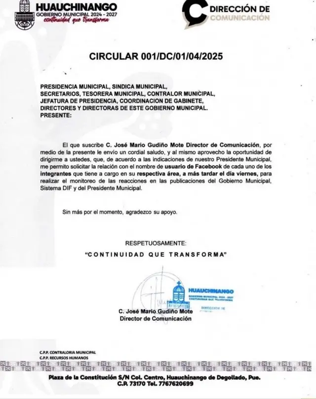Mediante una circular, el ayuntamiento de Huauchinango solicitó las cuentas de redes sociales de los trabajadores de la presidencia para monitorear las reacciones en las publicaciones del Gobierno Municipal.