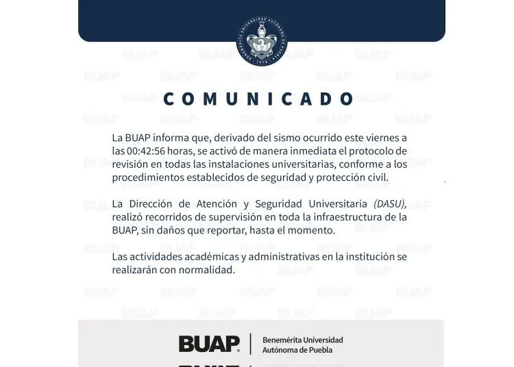 La autoridad de la Máxima Casa de Estudios en Puebla explica que, derivado del movimiento sísmico, activaron el protocolo de revisión de todas las instalaciones universitarias. Además, estas acciones se realizan conforme a los procedimientos establecidos de seguridad y protección civil.