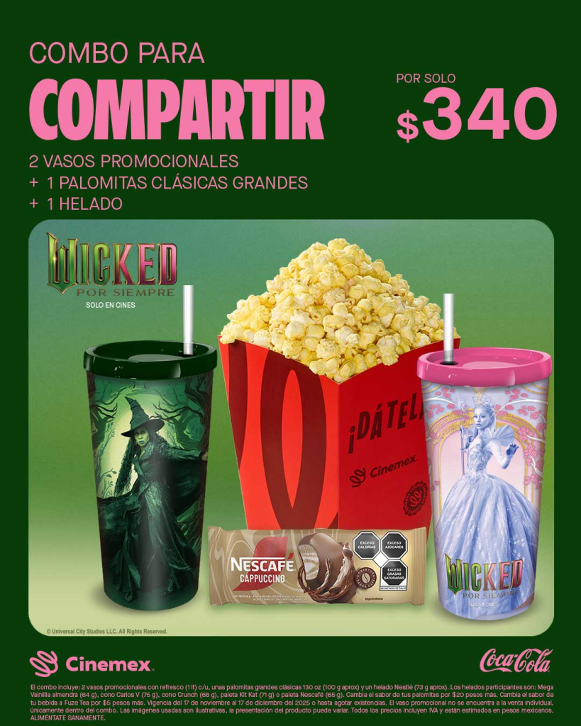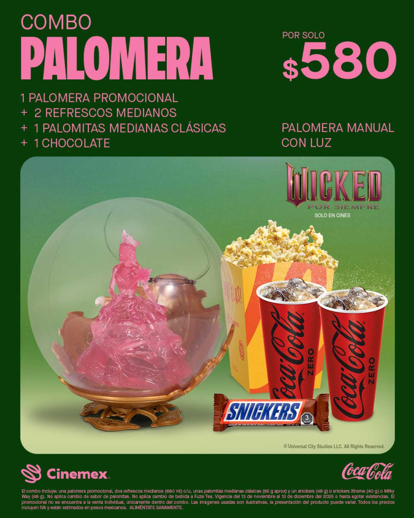 Cinemex ofrece dos combos promocionales que incluyen palomeras y vasos coleccionables, pensados para los fanáticos que buscan llevarse un recuerdo de la película. Los combos estarán disponibles hasta el 13 de diciembre o hasta agotar existencias, según indicó la cadena cinematográfica.