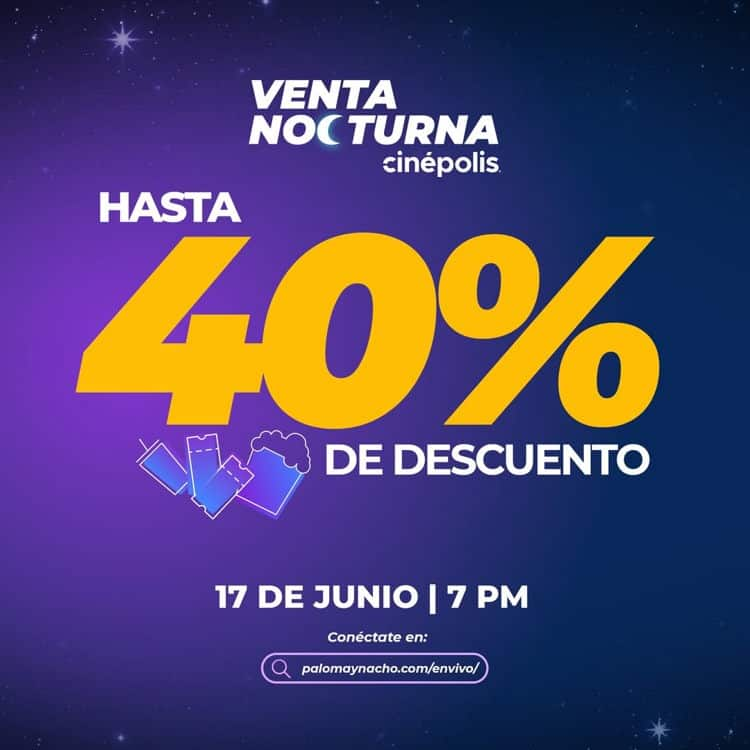 Cinépolis realizará su Venta Nocturna 2025 este martes 17 de junio en todas sus salas de cine en México. El evento fue anunciado a través del sitio oficial Paloma & Nacho, y ofrecerá descuentos de hasta 40% en boletos, palomitas y refrescos, . Esta oferta es parte de una campaña diseñada para atraer al público a las salas durante el verano.