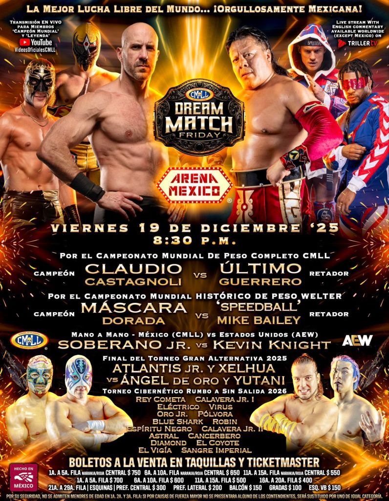 El Consejo Mundial de Lucha Libre (CMLL) presenta este Viernes Espectacular en la Arena México una función para cerrar 2025, con presencia de All Elite Wrestling (AEW), defensas de campeonatos y torneos decisivos, a partir de las 20:30 horas.
