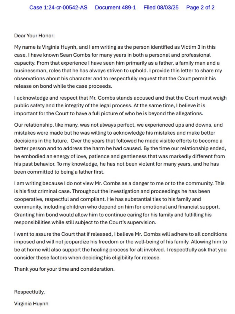 El problema: Huynh nunca testificó en el juicio. Desapareció antes de la audiencia y su equipo legal también desapareció. No obstante, su carta, presentada por los abogados de Diddy, busca que el juez le permita esperar sentencia en casa con una fianza de 50 millones de dólares.