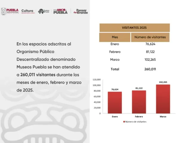 El informe también detalla que marzo fue el mes con mayor número de visitas, al registrar 102 mil 265. Le sigue febrero con 81 mil 122, y enero con 76 mil 624 asistentes.