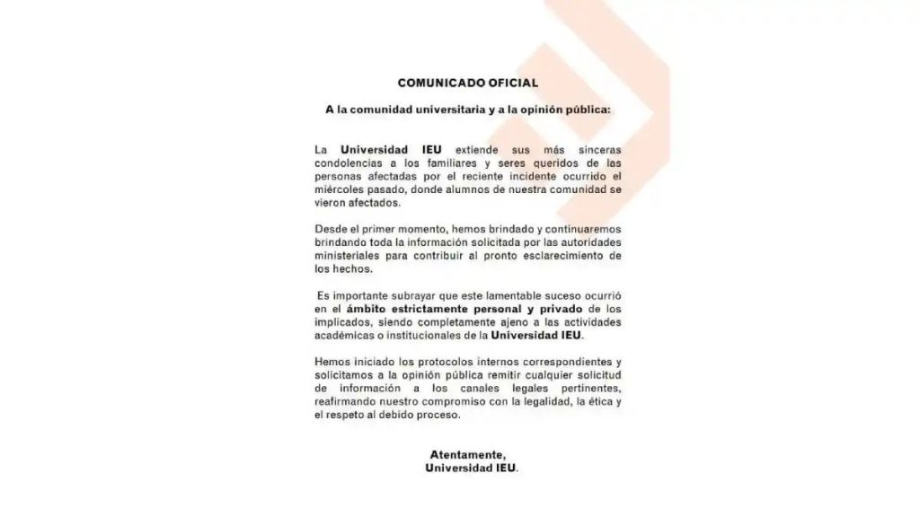 Añadió que este lamentable suceso “ocurrió en el ámbito estrictamente personal y privado de los implicados, siendo completamente ajeno a las actividades académicas o institucionales de la Universidad IEU”.