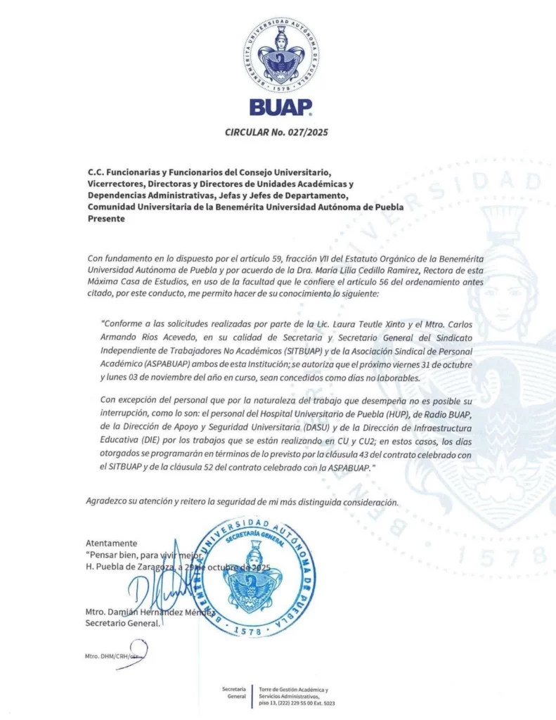La suspensión no aplica para el personal del Hospital Universitario de Puebla (HUP) y Radio BUAP.