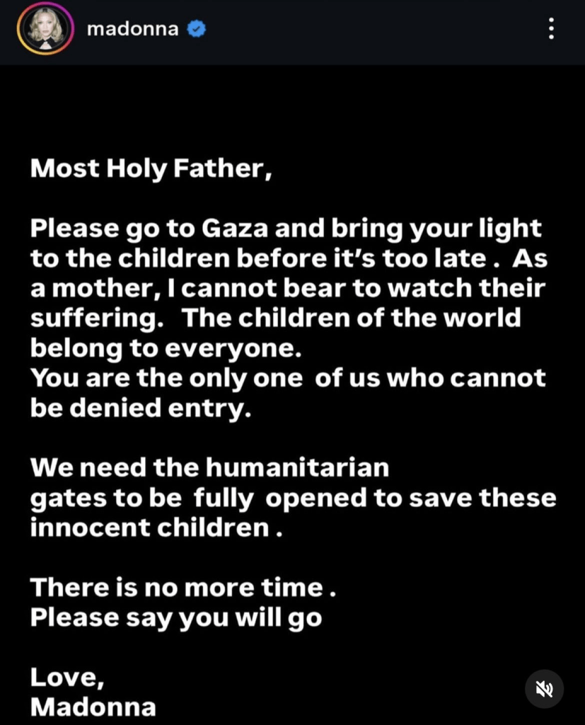 La cosa es que Gaza está hecha un infierno: bombardeos, hospitales colapsados, niños sin comida ni medicinas, y un número de muertos que da miedo solo leerlo. Madonna, en vez de quedarse viendo todo eso desde su mansión, decidió usar su altavoz global para pedir ayuda. No tomó partido, no se metió en política —dijo que no está para señalar culpables—, pero dejó claro que quiere que las puertas humanitarias se abran ya.