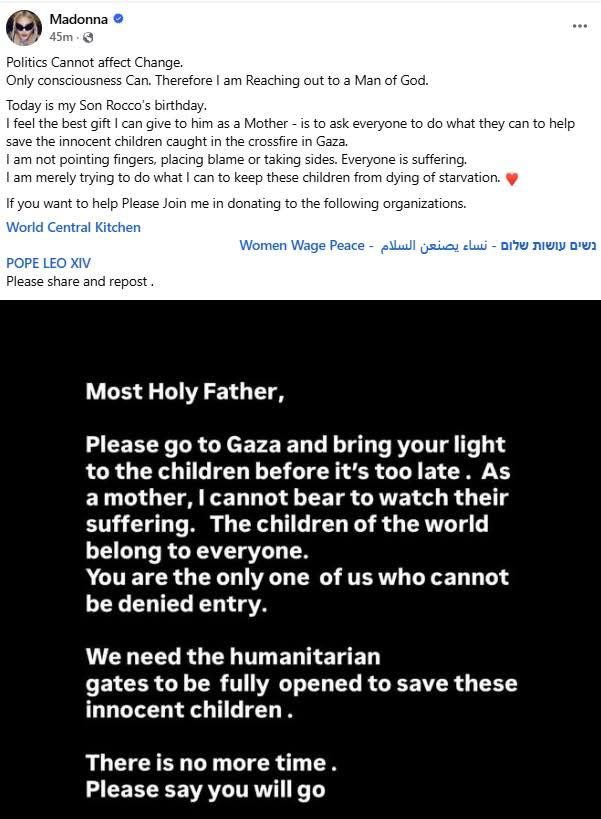 Y ojo al detalle sentimental: hizo este llamado el mismo día que su hijo Rocco cumplió 25 años. Según ella, sería el mejor regalo que podría darle: un acto para salvar vidas. Porque, claro, si eres Madonna y quieres celebrar, no basta con un pastel; pides al Papa que vaya a una zona de guerra.