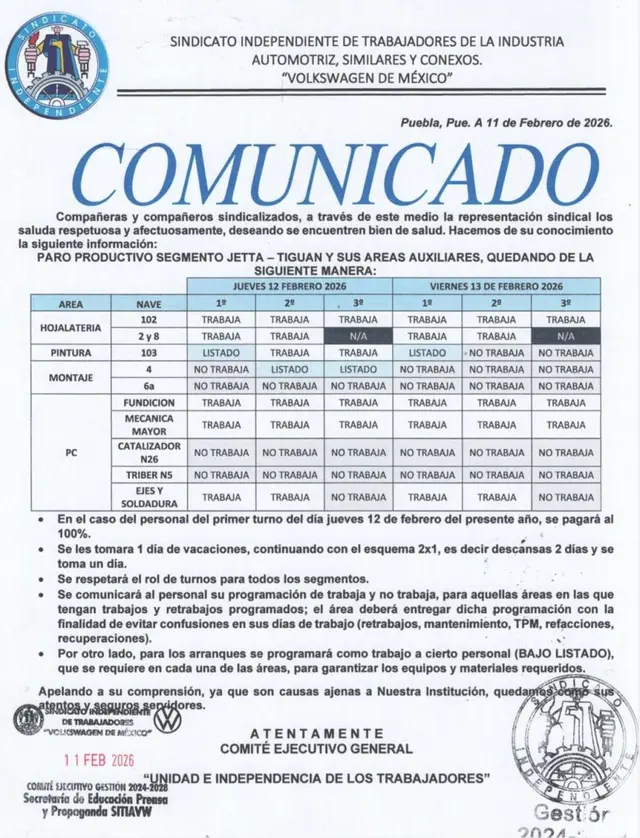 El 29 de enero el Sindicato Independiente de Volkswagen notificó que aún no se definía un acuerdo con la armadora alemana. El acuerdo corresponde al Calendario de Días Laborales 2026.