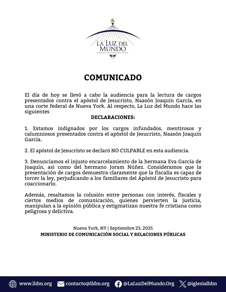 En la sala, la audiencia apenas duró quince minutos. Bastó para que Naasón repitiera la estrategia de siempre: rechazar cada acusación y confiar en el blindaje de sus abogados. Ellos son los mismos que lo han seguido desde California hasta Brooklyn. El próximo encuentro con la justicia quedó fijado para el 15 de diciembre. En esa fecha volverá a escucharse el eco de su voz en el tribunal.