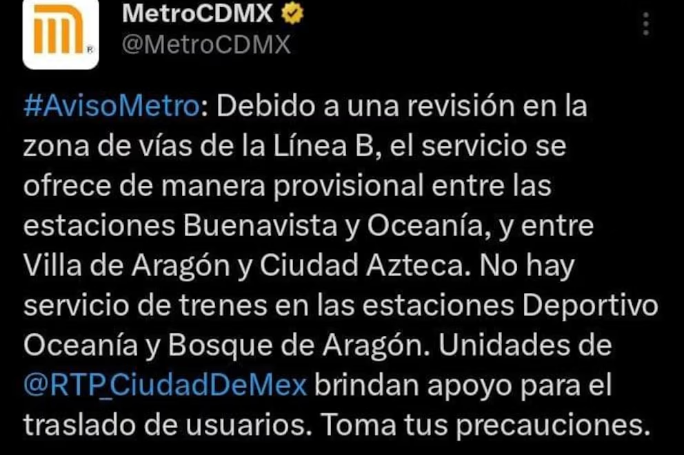 De acuerdo con lo informado por el transporte público capitalino en sus redes sociales oficiales, la Línea B del Metro de la Ciudad de México ofrece servicio al público de manera provisional entre las estaciones Buenavista y Oceanía y, entre Villa de Aragón y Ciudad Azteca.