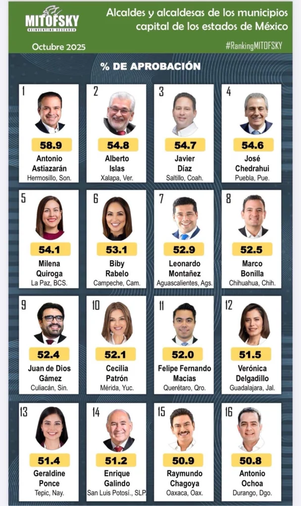 En las capitales de los estados de México, Chedraui Budib obtuvo una calificación de 54.6 y sólo su superaron los presidentes municipales de: