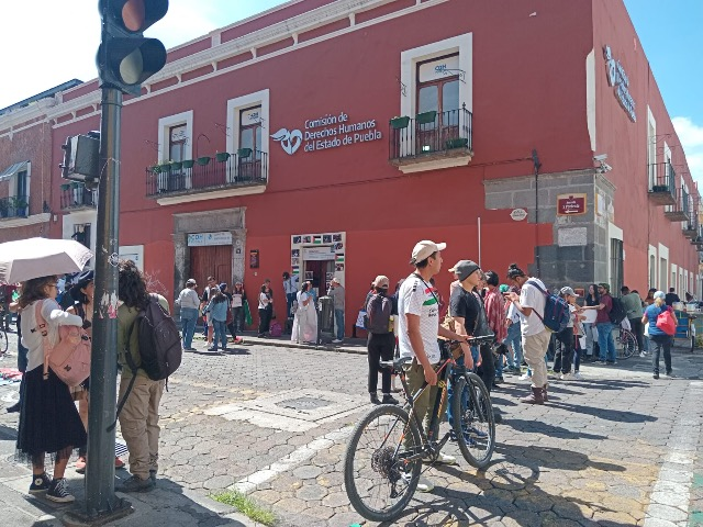 Poblanos y extranjeros se manifiestan en la sede de la Comisión de Derechos Humanos de Puebla, ubicada en la 5 Poniente y 5 Sur, para exigir el alto al genocidio y solicitar la liberación de mexicanos que forman parte de la tripulación de la Flotilla Sumud Global, interceptada por Israel cerca de Gaza.