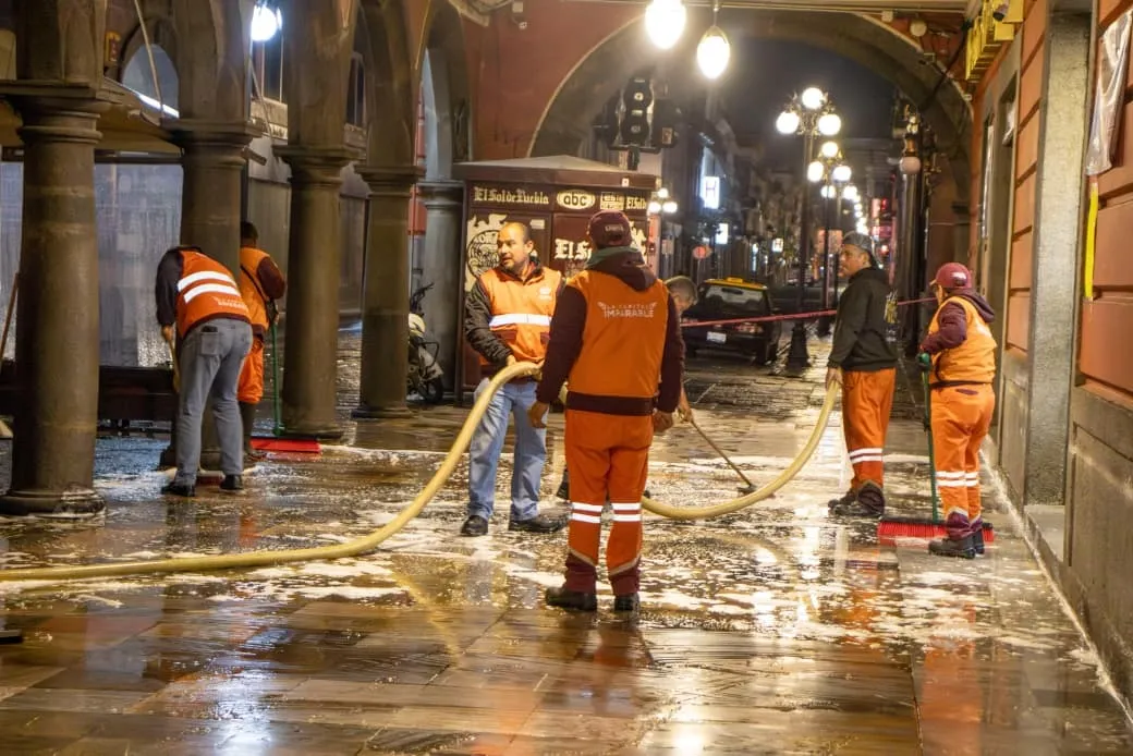 Por instrucciones del presidente municipal Pepe Chedraui, el Gobierno de la Ciudad, a través del Organismo Operador del Servicio de Limpia (OOSL), realizó el lavado integral de los portales Hidalgo, Morelos e Iturbide que rodean el Zócalo de Puebla, como parte de una estrategia para dignificar y fortalecer la imagen del corazón de la capital.