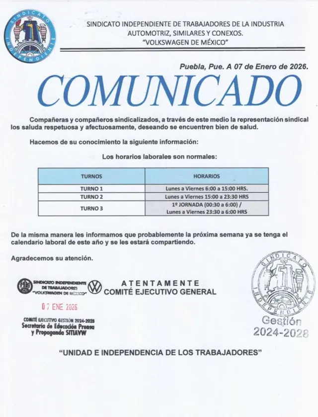 El Sindicato Independiente de Trabajadores de la Industria Automotriz Volkswagen (SITIAVW) ya definió su calendario de labores para 2026, con los horarios para los tres turnos que laboran para la armadora de origen alemán.