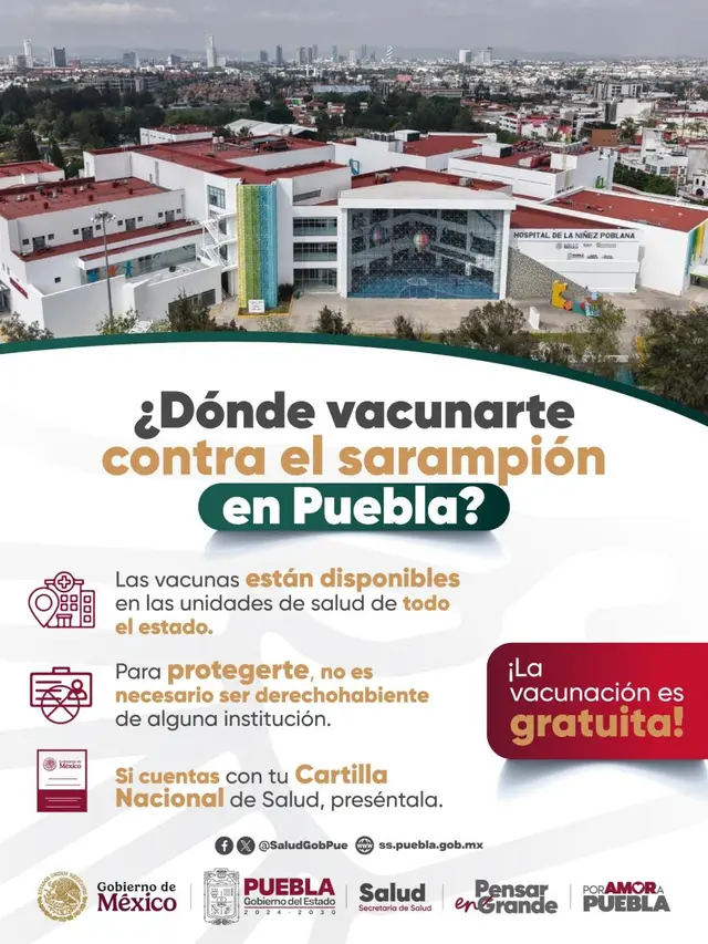 La vacuna contra el sarampión en Puebla se puede recibir de forma gratuita en todos los centros de salud del estado, donde se aplica a niñas, niños y personas menores de 49 años sin esquema completo.