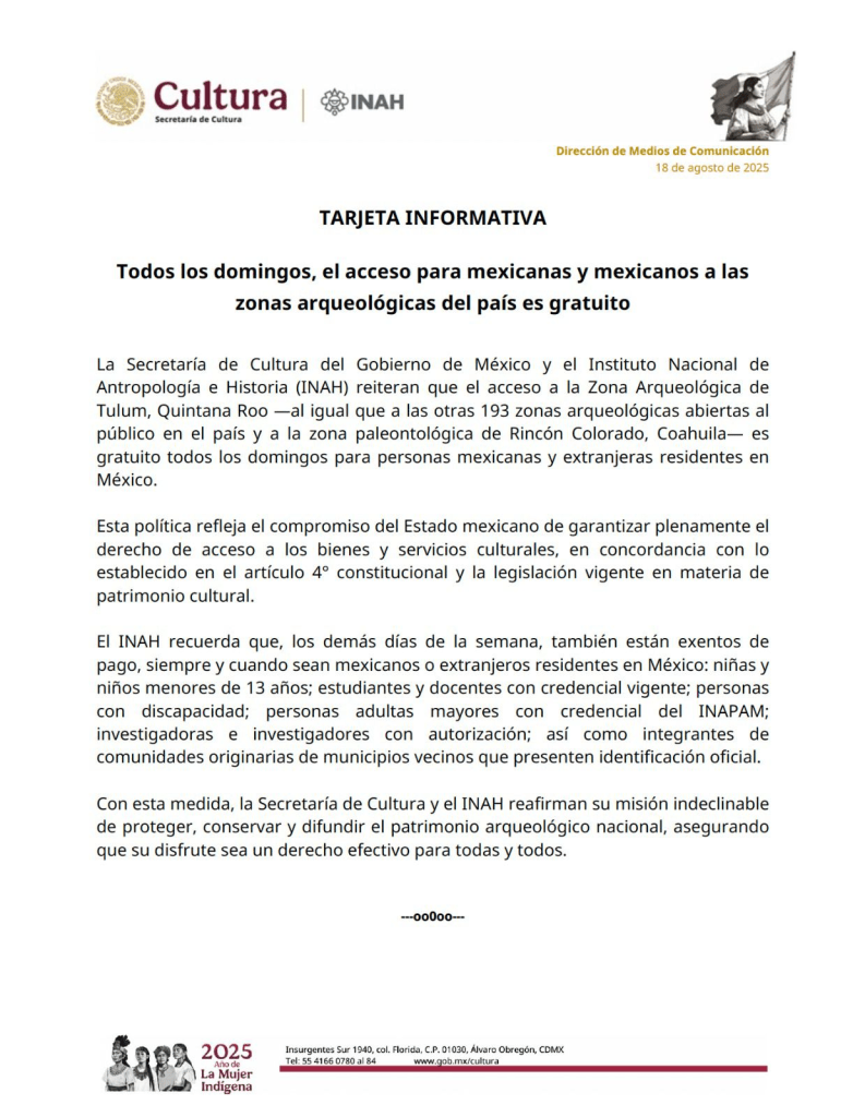 Fue así que este 18 de agosto se oficializó el acceso gratuito para mexicanas y mexicanos a las zonas arqueológicas del país. Así como a extranjeras y extranjeros que residen en el territorio.